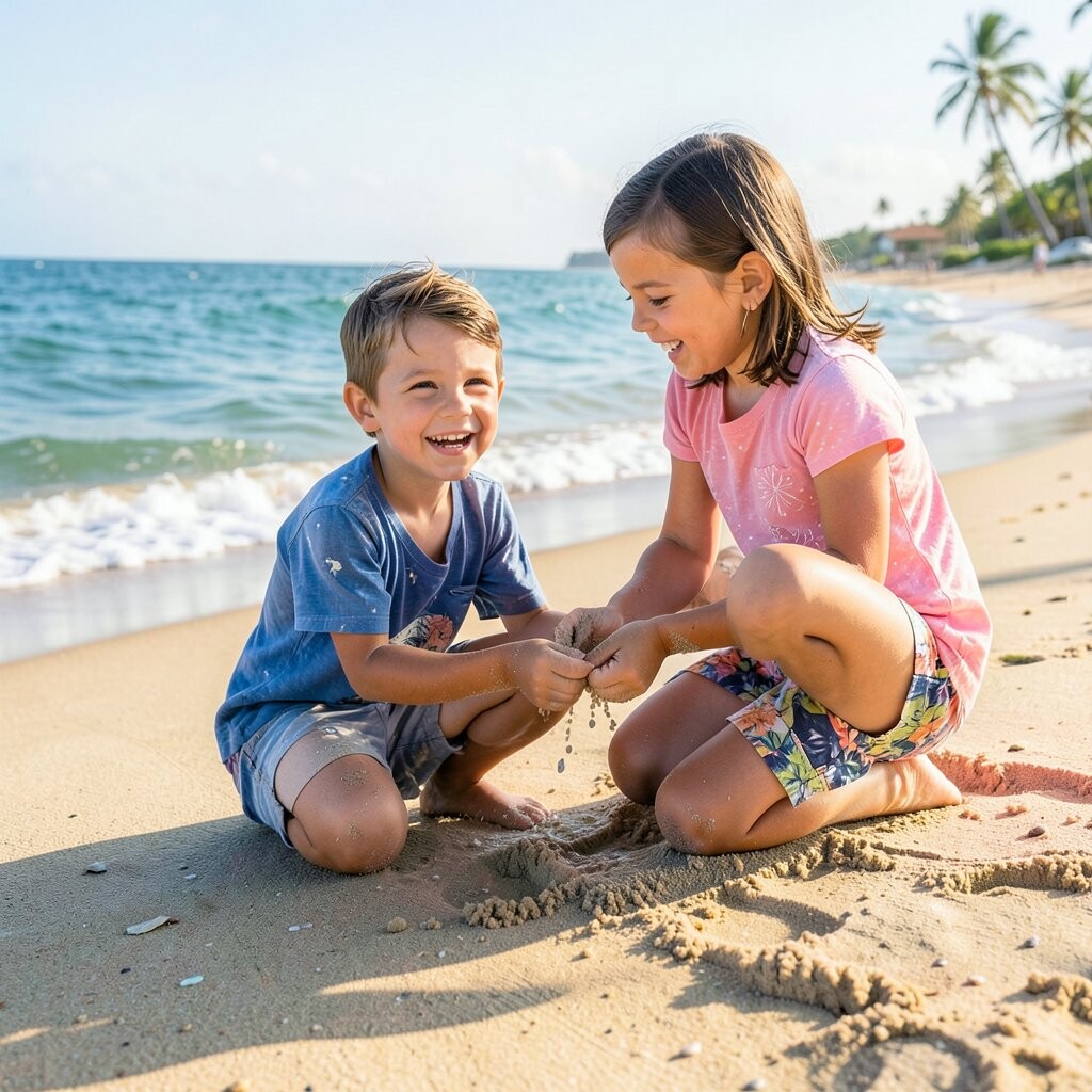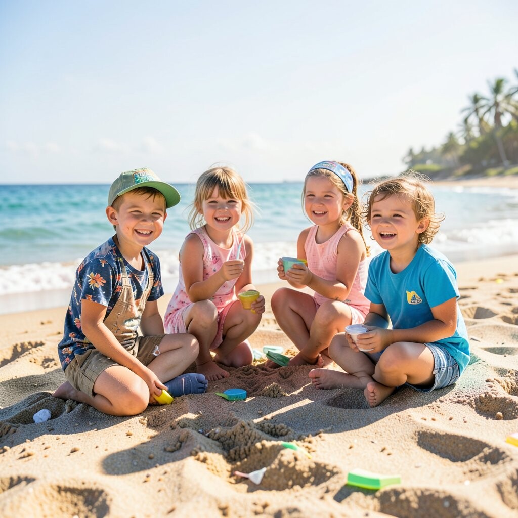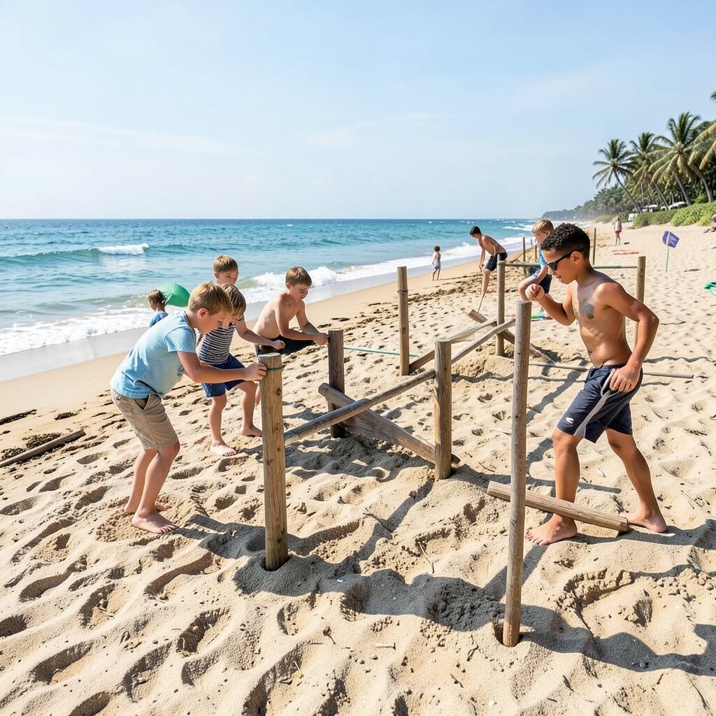 Create an obstacle course using sand and natural materials. Kids can jump over sand hills, crawl under driftwood, or balance on rocks. This activity keeps kids active and engaged.