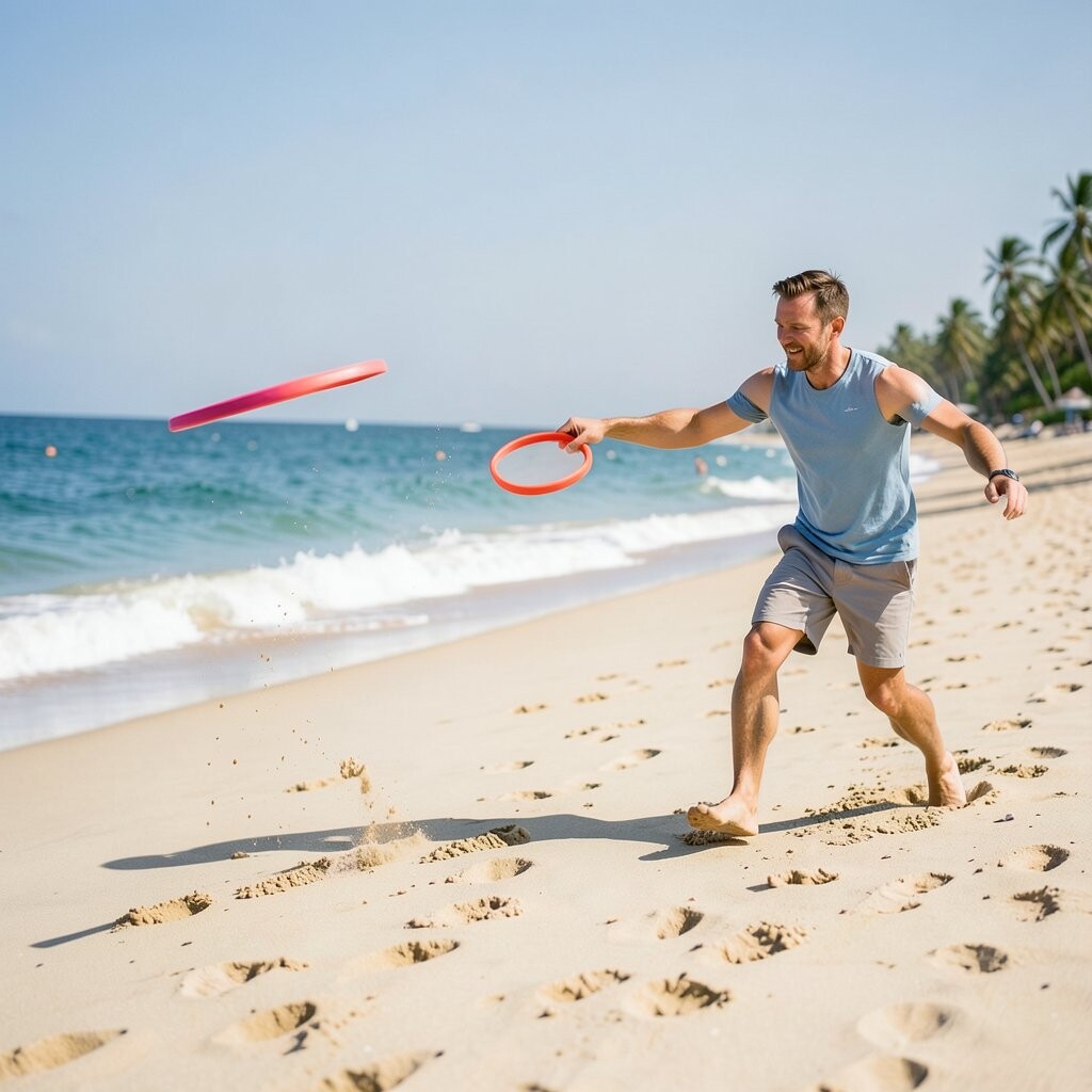 Playing frisbee on the beach is a fun and energetic activity for friends and family. The open space and soft sand make it easy to run and dive for the frisbee. This simple game can provide hours of entertainment without any cost.
