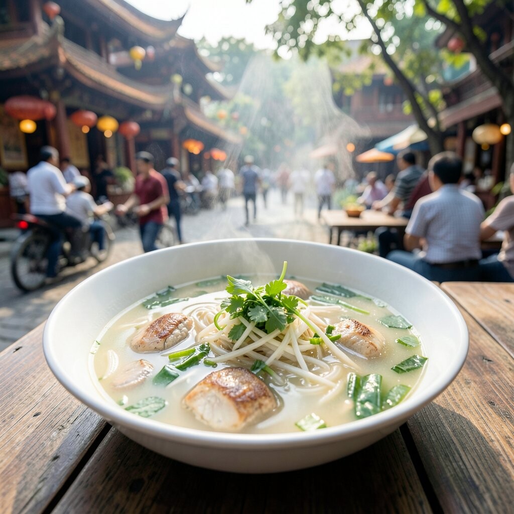 The soup is made with a savory broth, rice noodles, and choice of meat, often topped with fresh herbs. It’s a popular breakfast food in Vietnam.