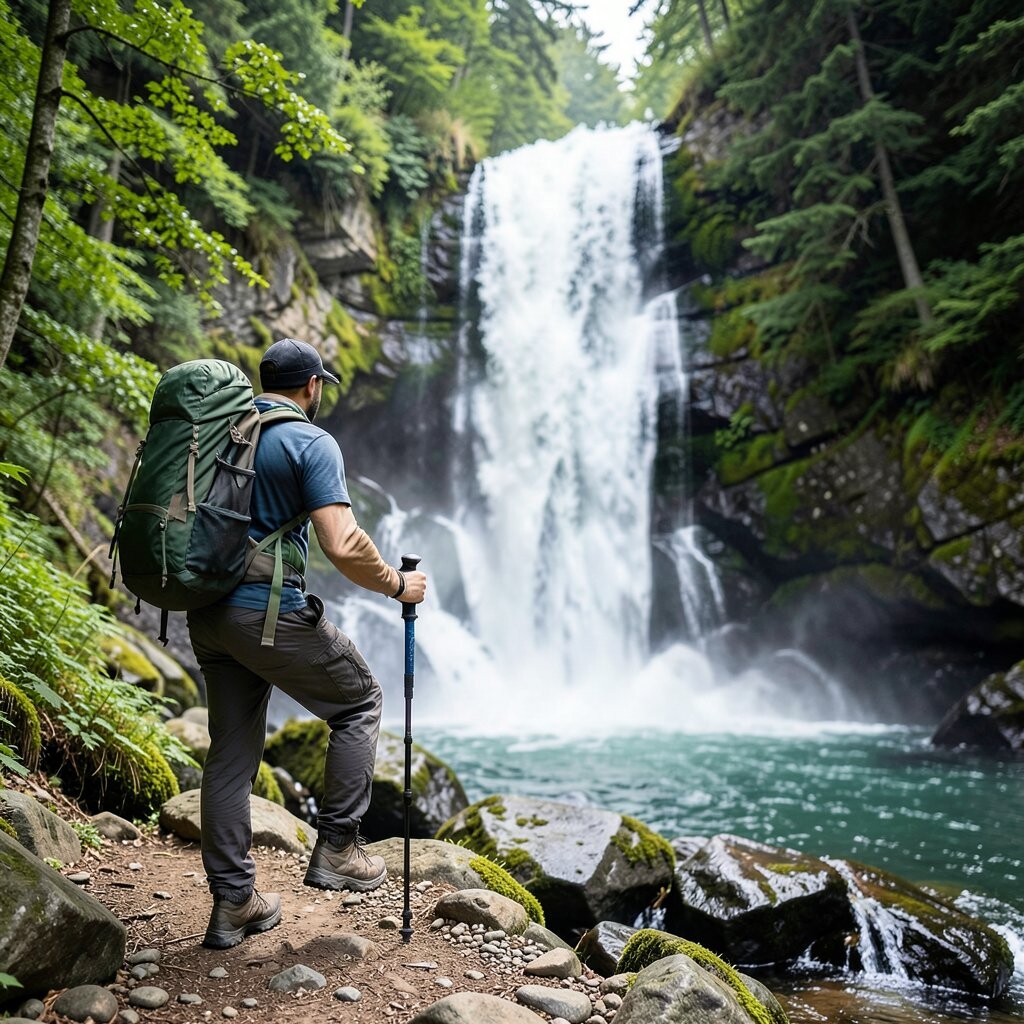 Standing near a waterfall, you can capture the power and beauty of nature. This pose is about appreciating the natural wonders you encounter. Waterfalls add a dynamic element to your hiking photos.