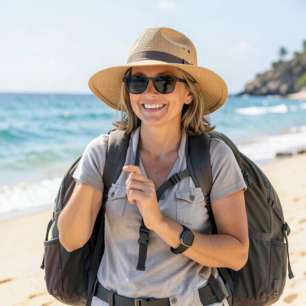 Pick a hat that complements your personal style and provides adequate coverage. Packable hats are convenient, maintaining their shape even after being stored in a suitcase. A hat with a chin strap is useful for windy conditions, keeping it secure.