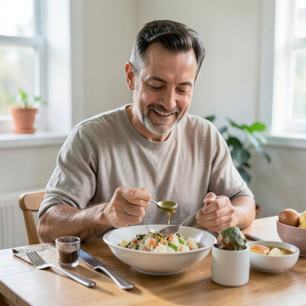 Mindful eating means paying attention to your food and savoring each bite. It helps you enjoy your meals more and can prevent overeating. Turn off distractions like TV and focus on your meal.